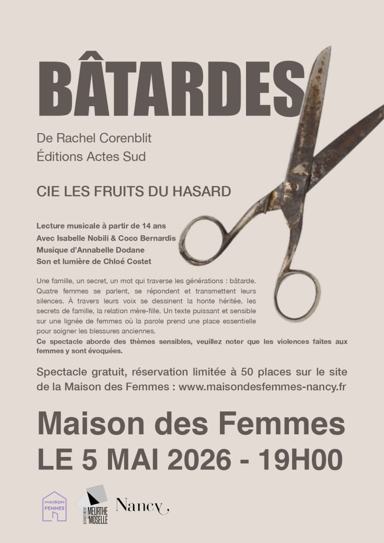 Entrée sur inscriptionLa Maison des Femmes de Nancy vous convie à la lecture musicale de Bâtardes de la compagnie les fruits du hasard Spectacle gratuit | À partir de 14 ans Ce spectacle aborde des thèmes sensibles,[...]
